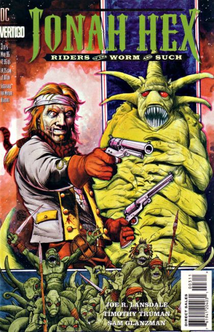 Hex learns the bizarre history of the singing cowboys' strange ranch...and of the giant carnivorous worms that have terrorized the Texas panhandle since ancient times. Written by Joe R. Lansdale, with art by Timothy Truman and Sam Glanzman. Painted cover by Truman. Suggested for Mature Readers. Deluxe Format. Cover price $2.95. Cover price $2.95.
