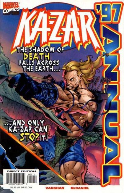 The Lord of the Savage Land swings into his own annual! Featuring the return of long-time Ka-Zar nemesis, Garokk the Petrified Man! Plus: find out how Parnival Plunder and his cosmic co-hort hooked up! It's a 48-page adventure with direct ties to the Ka-Zar ongoing series that leads right into the big revelation of who's really behind Parnival's sinister scheme! Written by Brian K. Vaughan (1st full story). Pencils by Walter McDaniel. Wraparound cover. Cover price $2.99.