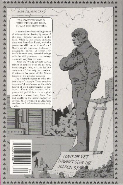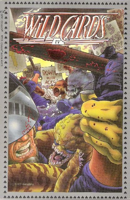 The deck seems stacked against the Aces as they must deal with protests by the Nats and the Jokers during the explosive climax of this comic book continuation of the popular series of novels. Written by Lewis Shiner, Stephen Leigh and Howard Waldrop. Art by Barry Kitson, Mickey Ritter, Gray Morrow, Marshall Rogers, John Tartaglione and Fred Fredericks. Cover by Jackson Guice. Cover price $4.50.