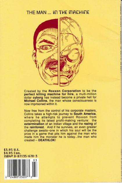 Now free from the control of his coporate masters, Collins takes a high-risk journey to South America, where he attempts to prevent Roxxon from completing its latest profit-making venture: The extermination of an Indian village and the razing of the rainforest. And if he survives, an even greater challenge awaits - - - one in which his soul will be the prize in a game that pits him against the man who made him the monster he is today . . . the man who created - - Deathlok!