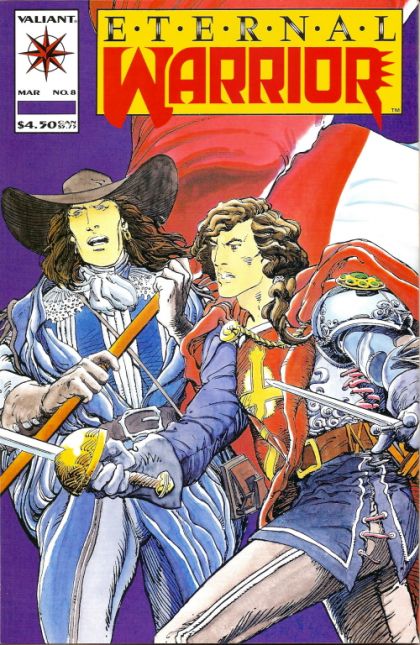 This double-sized epic actually combines Eternal Warrior #8 and Archer and Armstrong #8 into one unforgettable tale; It is the story of how immortal brothers, Gilad, Aram, and Ivar, were the original Three Musketeers; In fulfilling his duty as the Fist and Steel of the Geomancers, Gilad dupes his brothers into helping the cause; But, when they realize the truth, Aram and Ivar part ways with Gilad, who places duty over brotherhood; Characters: Archer; Armstrong; D'Artagnan [Archer look-alike]; Duchess Angelique D'Terre (geomancer); Eternal Warrior; Ilysee; Ivar; King Louis XIV of France; his twin brother Henri.