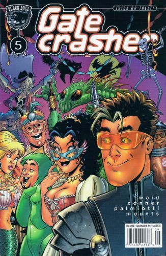 Cover by AMANDA CONNER. Written by MARK WAID with JIMMY PALMIOTTI. Art by AMANDA CONNER, inks by JIMMY PALMIOTTI. Colors by PAUL MOUNTS. IT'S GATE NIGHT FOR GATECRASHER! It's a massive Halloween party and Alec finally has the perfect date--despite the fact that an alien invader is secretly skulking around the party with an eye on killing Alec. Alec's got to find his assassin before his assassin finds him, all while trying to keep his cover and maintain his date. Also: Trystan seals a bargain with a mysterious figure--could he really be so eager to regain his girlfriend Teah that he'd sell out the Squad and the Earth? Cover price $2.50.