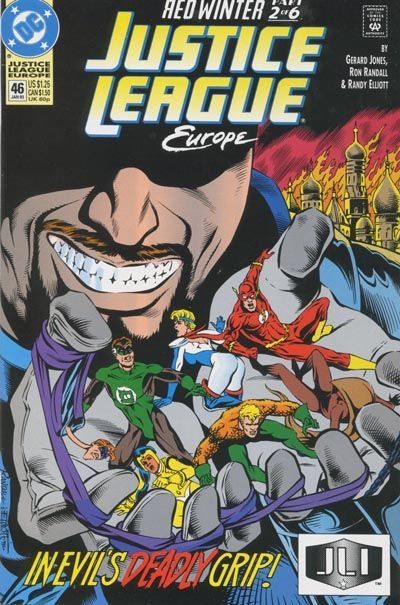 Red Winter, Part 2 of 6. The JLE is held captive in Russia at the mercy of a mystery villain. Meanwhile, the carnage in the fragmented Soviet Union continues as the villain's diabolical plans begin to fall into place. Written by Gerard Jones, with art and cover by Ron Randall and Randy Elliott. Cover price $1.25.