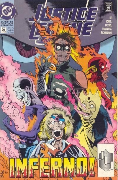 The League is routed, its headquarters in ruins, all at the bidding of the mysterious leader of a worldwide conspiracy of terror. After this adventure, two members leave for good. Written by Gerard Jones and Will Jacobs, with art by Mike Collins and Romeo Tanghal. Cover pencils by Lee Moder. Cover price $1.25.