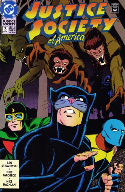 "Out of the Past." The Atom and Wilcat investigate Ultragen, a company that evokes The Island of Dr. Moreau. Features the return of Johnny Quick and Johnny Thunder. Script by Len Strazewski, pencils by Mike Parobeck, inks by Mike Machlan. Cover by Mike Parobeck. Cover price $1.25.