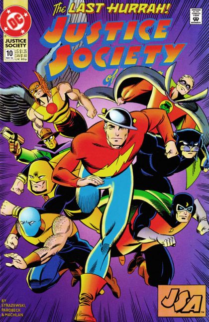 "J.S.A. No More?" Starman returns to the JSA, but Jesse Quick takes the spotlight as she talks about what it means to be a hero, wrapping up the short-lived series in relatively fine fashion. Script by Len Strazewski, pencils by Mike Parobeck, inks by Mike Machlan. Cover by Mike Parobeck. Cover price $1.25.