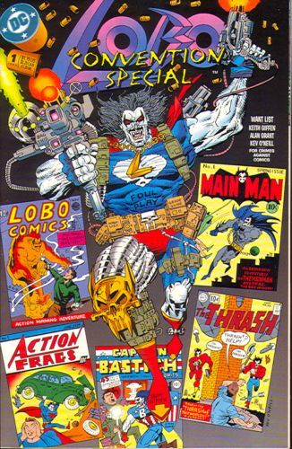 Fanboys and speculators, watch out! The Main Man is hitting the convention circuit in search of another copy of SUPERMAN #75, the polybagged edition with the armband, because he laughed so hard reading his first copy that he tore it in half! And that's exactly what he'll do to any fanboy who tries to gouge him! It's the LOBO CONVENTION SPECIAL, and it's the most fun you'll have all summer. Imagine the satisfaction of seeing Lobo coping with registration lines, cleaning his teeth with hologram trading cards, and using polybags as only he can.