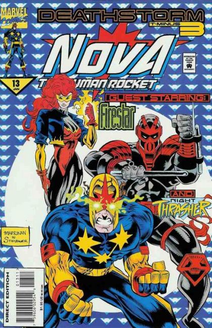 Nova manages to talk sense into the Inhumans, and then comes back to Earth to investigate the Deathstorm further. With the help of Night Thrasher and Firestar, he puts another dent in the Shadow Consortium production.