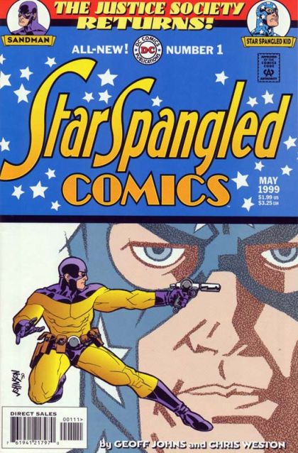 In Manhattan, Sandman and Sandy, the Golden Boy face ordinary citizens driven to rage. They are the victims of one of Stalker's disciples. This one absorbs minds, leaving his victims insane and violent. Sandman and Sandy find him, but he is already engorge on mental energy; as they watch, he draws in more minds and grows larger! Sandy is hurled out of the building - fortunately the Star-Spangled Kid and Stripsey are flying by in the Star Rocket Racer and can rescue him. The disciple is now large enough to climb the Chrysler Building, and he's got the Star-Spangled Kid's mind into the bargain! Stripsey must kayo his partner, and then turn his engineering skills to modifying the Star Rocket Racer for a suicide run, to crash into the giant! But how to keep him busy? That answer is The King, a master of disguise and information, who distracts the giant by aping his dead father. At first this works, but then the monster becomes enraged again. Fortunately, Stripesy is ready. Equally fortunately, Sandy uses his wirepoon to carry himself and Stripesy to safety as the machine smashs into and destroys Stalker's disciple, freeing the insane New Yorkers. But the heroes get only a brief respite, as Doctor Occult arrives to whisk them magically to the real fight against Stalker.