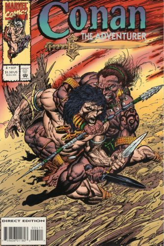 Cover by Rafael Kayanan. Between Twin Terrors, script by Roy Thomas, art by Rafael Kayanan; As Conan and Andamo watch, the Golem is set upon by a metal golem; As they do battle, their masters watch from on high; When Conan is captured, Andamo flees and he is saved by Moru; They then enter battle with Conan, causing the monsters to fuse together and their masters to burst into flames; Moru's woman dies, but all he cares for is a golden shard left by a priest; Andamo secures the other and they all go their separate ways. Letter from writer Robert Weinberg. 36 pgs., full color. $1.50. Cover price $1.50.