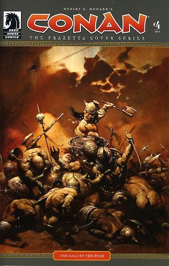 CONAN: THE FRAZETTA COVER SERIES #4 Mike Mignola (W), Cary Nord (P), Dave Stewart (C), and Frank Frazetta (Cover) On sale Mar 10 FC, 48 pages $5.99 Ongoing The fourth installment in Conan: The Frazetta Cover Series features Frank Frazetta's stunning painting, 'The Destroyer,' and includes an adaptation of 'The Hall of the Dead'-an unfinished tale left by Robert E. Howard and fleshed out by Mike Mignola, Cary Nord, and Dave Stewart. Pursued by a small army, Conan heads for shelter in the ancient ruins of a forgotten city, lured by a flimsy rumor of treasure. Instead, he finds the fallen idols of twisted gods and a lot of croaking creatures. Luckily, frogs are no match for an armed Cimmerian . . . right? Conan soon finds himself battling a slithering monstrosity and an onslaught of undead warriors! Retainers to a lord long forgotten awaken to protect a treasure so sizable even the dead can't bear to see it stolen. Can a cunning Cimmerian and a foe-turned-ally withstand the power of such dark sorceries long enough to escape with some loot and their lives? Conan the Cimmerian ? 2010 Conan Properties International LLC ('CPI'). CONAN, CONAN THE BARBARIAN, THE SAVAGE SWORD OF CONAN, HYBORIA, and related logos, characters, names, and distinctive likenesses thereof are trademarks or registered trademarks of CPI. All rights reserved.