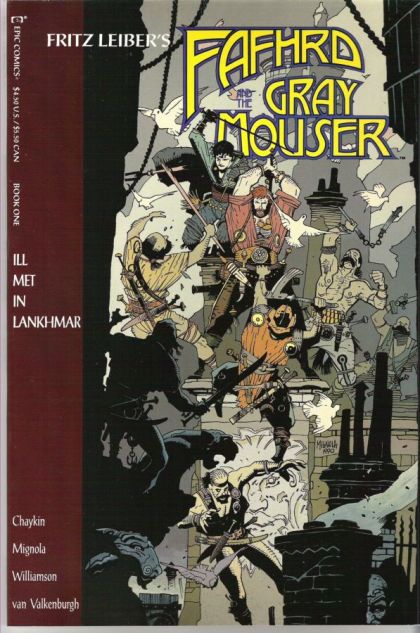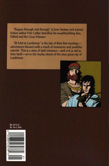48-page squarebound giant (no ads). Cardstock cover, art by Mike Mignola. Ill Met In Lankhmar, script by Fritz Leiber (original story) and Howard Chaykin (adaptation), pencils by Mike Mignola, inks by Al Williamson; The tale of their first meeting of the swashbuckling duo, Fafhrd and the Gray Mouser, adventurers blessed with a touch of innocence and youthful naivete; This is a story of dark romance- and evil as old as time itself- set in the murky streets of the once great city of Lankhmar. Short biographies on Fritz Leiber, Howard Chaykin, Mike Mignola, Al Williamson and Sherilyn Van Valkenburgh (colorist). Fafhrd and the Gray Mouser illustration by Mike Mignola. Based on Fritz Leiber's characters. 52 pgs., full color. $4.50. Cover price $4.50.