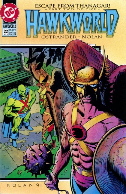 Escape from Thanagar, Part 2 of 5. With all-out civil war having broken out on Thanagar, Katar Hol is forced to choose sides between the government and the rebels. Martian Manhunter guest-stars. Written by John Ostrander, with pencils and cover by Graham Nolan. New Format. Cover price $1.50.