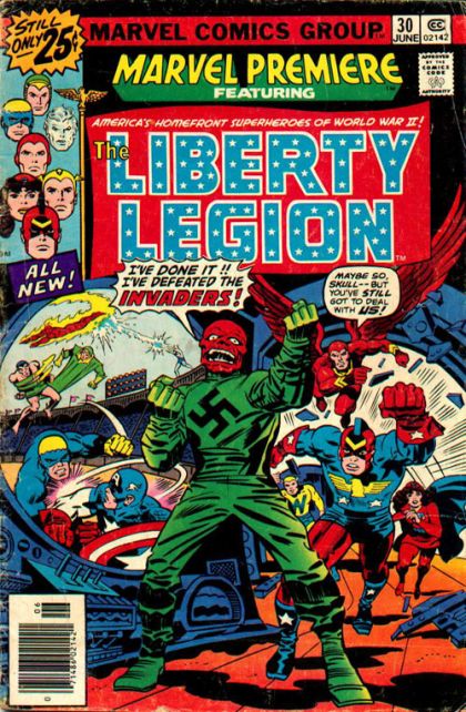 The Invaders/Liberty Legion Crossover: Part 4 of 4 - "Hey, Ma! They're Blitzin' the Bronx!" Guest-starring the Invaders. Written by Roy Thomas. Art by Don Heck and Vince Colletta. Story continued from Invaders (1975-1979 Marvel 1st Series) #6. Can the greatest heroes of World War II shake the mind control of the diabolical Red Skull before New York City falls? The Invaders/Liberty Legion crossover comes to shocking conclusion. Featuring the Liberty Legion: The Patriot (Jeffrey Mace), Red Raven, the Thin Man, the Whizzer, Miss America, Jack Frost and the Blue Diamond. The Invaders: Captain America, the Sub-Mariner, Human Torch, Bucky and Toro. 32 pages FC. Marvel Value Stamp. Cover price $0.25.