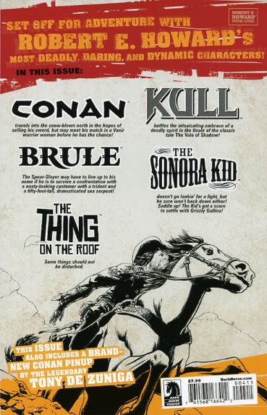 Various (W/A) Robert E. Howard's Savage Sword #4 features eighty full-color pages crammed with the best creators in comic books putting their spin on Robert E. Howard's finest creations! Sean Phillips takes on Conan! David Lapham writes the conclusion to the seafaring adventure of Kull's right-hand man in 'Brule: The Spear and the Siren.' The Sonora Kid has a buffalo-sized showdown with Grizzly Gullins. We bring you one of Howard's most frightening stories, and to top it off, part 2 of Kull: The Vale of Shadow!