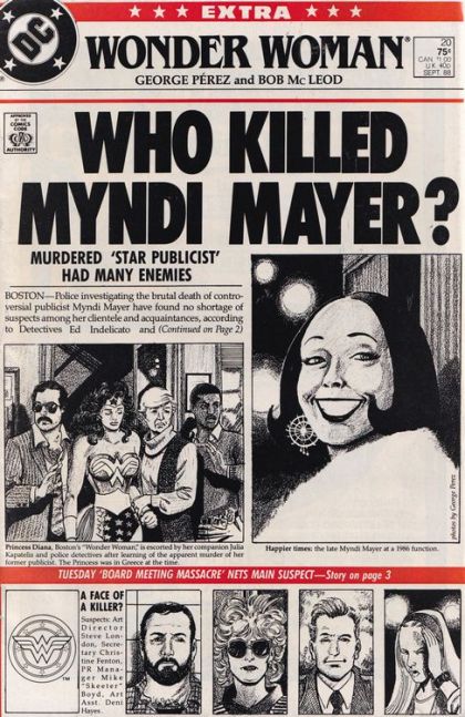 Detective Ed Indelicato investigates the murder of Myndi Mayer while Wonder Woman does her own "investigation". Myndy Myer's business was being used as a front to sell cocaine to high profile customers behind her back, although she was a "cutomer" herself. It appeared that former employee, Steve London, was guilty of the murder. Wonder Woman is convinced it was Michael Boyd, the cocaine seller who admitted to it after being encircled by her Lasso of Truth. Detective Indelicato later finds out she was already dead when Boyd shot her, she had overdosed on alchohol and cocaine.