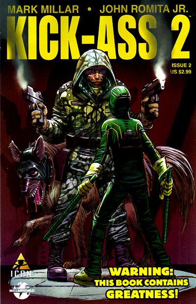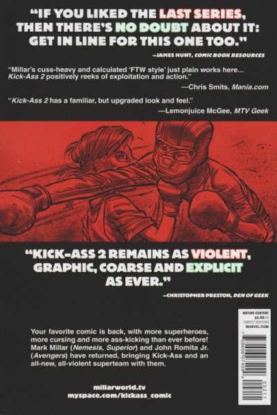 Written by MARK MILLAR PencilS & Cover by JOHN ROMITA JR. The sequel to the New York Times best-selling comic--which spawned the hit movie--continues! When Dave Lizewski put on his mask and became Kick-Ass, he never imagined things would go this far. Now Dave comes face-to-face with a world he helped bring about, as his dreams of a world of superheroes come true...but will those dreams turn to nightmares? Don't miss the comic book event of the year! Plus: Hit-Girl! 32 PGS./ Mature?$2.99