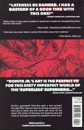 Written by MARK MILLAR Pencils & Cover by JOHN ROMITA JR. Red Mist takes on a new identity too vulgar for print and issues a command to all his super-bastards on Twitter to wreak havoc on New York. Meanwhile, the cops are cracking down on all costumed activity and tracing the secret identities of all the heroes. Could Dave get a knock on his door, and has enough spit hit the fan for Hit-Girl to pick up her sword again? 32 PGS./Mature