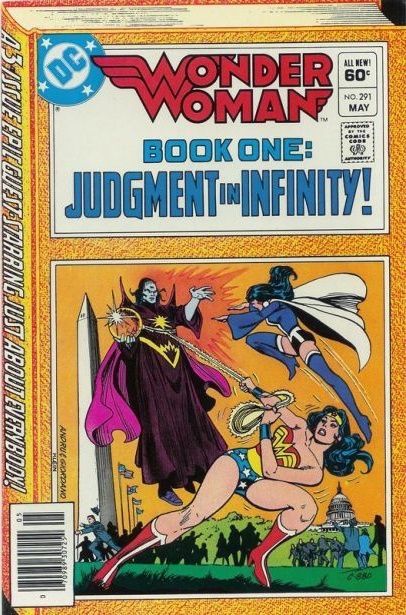 Suddenly, the alien notices Wonder Woman is reading his thoughts. Before Wonder Woman can talk him out of destroy Earth he cuts off the mind-link and vanishes. Still Wonder Woman sensed his intent to visit other Earths and put them to his tests. If he destroys one of them, he'll set off a chain reaction which will destroy all alternate Earths. Diana also learned his name is the Adjudicator.