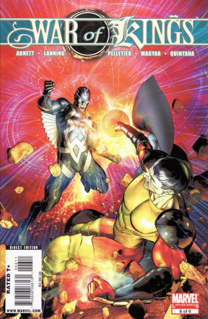 Vulcan and Black Bolt are fighting hand to hand to determine the final outcome of the Kree/Shi'Ar war. Black Bolt has activated the T-Bomb. If it detonates as planned, he'll succeed in elevating all regular life to Inhuman status throughout the galaxy, eliminating a lot of the current attitudes. However, the intensity of the battle may distort the device, resulting in the predicted hole in space and time that the Guardians of the Galaxy warned him about.