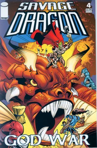 Found unconscious and naked in a burning field, a super-powered amnesiac was recruited by the Chicago Police to help fight their war on crime. Now the ex-cop fights a never-ending battle to restore order to a world in chaos. Savage Dragon fights to save the city of Chicago and the world itself from the sinister forces of evil. THIS ISSUE: The end is really nigh this time! Dragon and what's left of the Gods must unite to stop an ancient evil that threatens to end all life on this planet. This epic battle was so big it wouldn't FIT in three issues, so we've expanded this mini by one issue, bringing you more GOD WAR action! This issue is not to be missed!