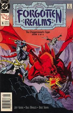 The Dragonreach Saga! Part 2 of 4. "Dragonspawn!" Story by Jeff Grubb. Art by Rags Morales and Dave Simons. While Omen takes council with Elminster, considered by many to be the wisest man in all the Realms, and Mourngrym , Lord of Shadowdale (another prominent figure in the world of the Forgotten Realms), the dragon, Muri, takes the rest of the crew of the Realms Master to a gathering of all the great good, evil, and neutral wyrms of the land. But can Priam, a lawful good paladin, bring himself to consort with evil dragons? Even if it is for the good of the land? Plus, betrayal lurks in the very ranks of the dragons. Cover price $1.50.