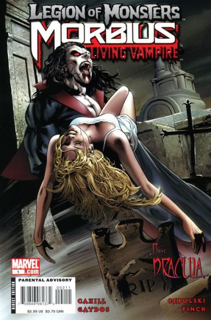 Written by C.B. CEBULSKI & BRENDAN CAHILL Penciled by DAVID FINCH & MICHAEL GAYDOS Cover by GREG LAND Brendan Cahill and Michael Gaydos (ALIAS) take Morbius the Living Vampire through the deepest depths of terrifying addictions in a devastating fully painted horror tale...and C.B. Cebulski is joined by superstar David Finch (NEW AVENGERS, MOON KNIGHT) to present an untold tale of the king of vampires-Dracula-and his beautiful daughter, Lilith! Terror has never looked as good as these frightening fables! 32 PGS./Parental Advisory ...$2.99 Cover price $2.99.