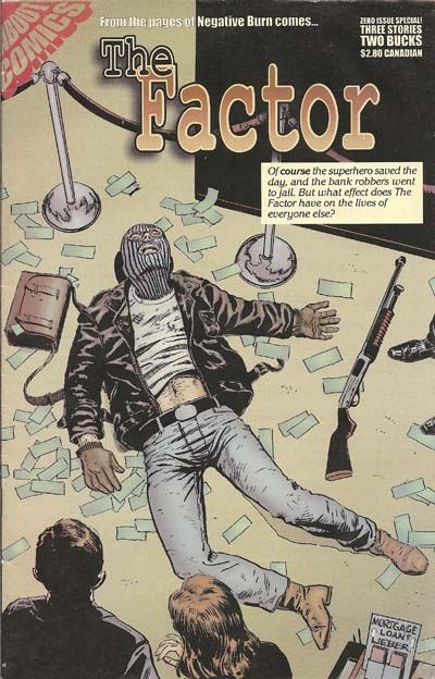 Cover by Steve Lieber. Exposure, script by Nat Gertler, pencils by Adam Rex, inks by Paul Whitehead; The effect the Factor stopping a bank robbery has on witnesses and the news. Arms And The Man, script by Nat Gertler, art by Janine Johnston; Lila has a date with Paul, but dreams of The Factor. Protection, script by Nat Gertler, art by Alex Grecian; A small-time crook tries to start a protection racket claiming he's working with the Factor. The Factor illustration by Carlos Saldaña. 36 pgs., B&W. $2.95. Cover price $2.00.
