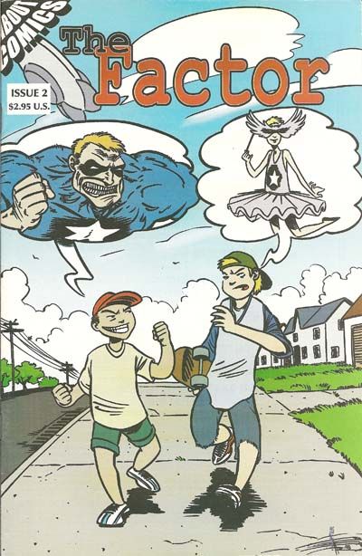 Cover by John Drury. Da Oudda Towners, script by Nat Gertler, art by Matt Feazell; A honeymooning couple is robbed. In Need, script by Nat Gertler, art by Tom Luth; An old woman is mugged, but the Factor's not there to save her. Clothes Making, script by Nat Gertler, art by Carla Speed McNeil; A woman chooses a Factor costume for a fancy dress party. Essay, script by Nat Gertler, art by Rich Johnston; A college essay about The Factor. The Green Diamond Protocol, script by Nat Gertler, art by Carlos Saldaña; A Japanese spy is operating in New York. Dull Summer Day, script by Nat Gertler, art by Paul Whitehead; Some guys plan a robbery. Dull Summer Day, script by Nat Gertler, art by Jeff Koenig; Some guys plan a robbery; This is the same script as the previous story, interpreted by a different artist. 36 pgs., B&W. $2.95. Cover price $2.95.