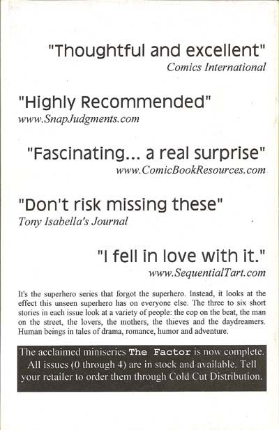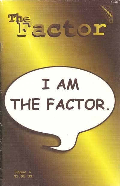 I Am The Factor, script by Nat Gertler, art by Justine Shaw; Deke Tsakos claims to be The Factor. I Am Too The Factor, script by Nat Gertler, art by Rich Johnston; A woman coming home late and drunk claims she's The Factor. I Am The Factoy, script by Nat Gertler, art by Rusty Haller; A bunch of toys need someone to find the dino-tots. News Carrier, script by Nat Gertler, art by Jim Wheelock; The paper boy's delivery round. At Joe's Lunch Stop, script by Nat Gertler, art by Jason Whitley; The conversation at a diner regarding The Factor's disappearance. 36 pgs., B&W. $2.95. Cover price $2.95.
