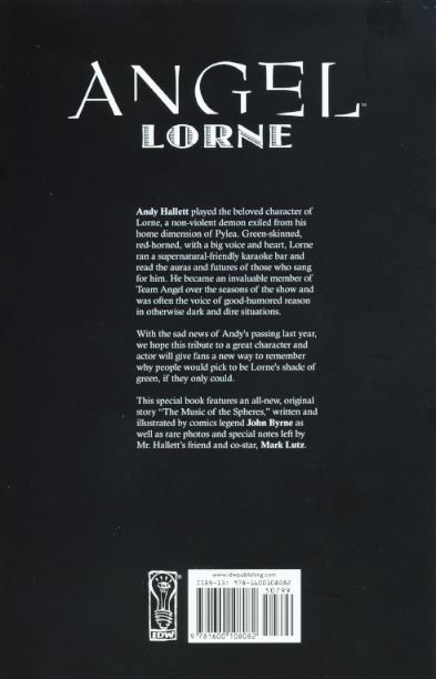 John Byrne (w & a & c) The world is in peril (again!), and only the most unlikely member of Angel's entourage is able to save the day. A special book-length tribute to the late Andy Hallett and his character, Lorne, presented by writer-artist John Byrne. 2 regular covers will be shipped in a 1-to-1 ratio.
