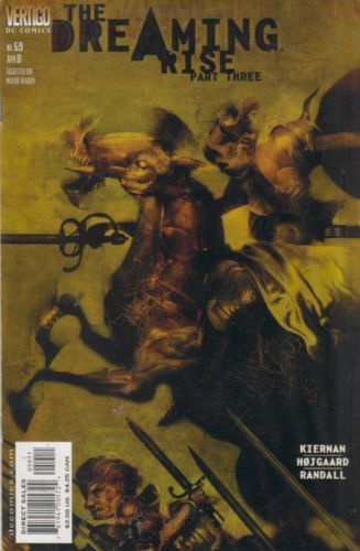 WRITTEN BY CAITLÍN R. KIERNAN; ART BY CHRISTIAN HOJGAARD AND RON RANDALL; PAINTED COVER BY DAVE MCKEAN Part 3 of the 4-part "Rise," the final story arc of THE DREAMING. Echo continues her bloody assault on The Dreaming, leading an army of Nightmares to the gates of Lord Shaper's Palace. In the wake of the murder of his latest Raven, and with his kingdom in chaos, Daniel must make a fateful decision that will forever change the landscape of the Dreaming. Also guest-starring Cain, Abel, Brute, and Glob. MATURE READERS FC, 32 PG. Cover price $2.50.