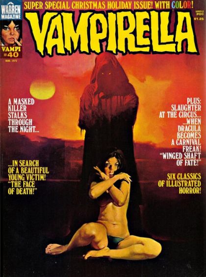 Stories in this Special Christmas Holiday Issue include: "The Nameless Ravisher" (starring Vampirella); "Winged Shaft of Fate" (in full color); "The Face of Death"; "The Man Who Never Was"; "The Time Eater"; and "Home for the Holidays." Written by Gerry Boudreau, Jack Butterworth, Fernando Fernandez, Budd Lewis, Flaxman Loew, and Carl Wessler. Art by Luis Bermejo, Jose Gonzalez, Fernando Fernandez, Esteban Maroto, Paul Neary, Leopold Sanchez, and Ramon Torrents. "Vampi's Vault" has a feature on Berni Wrightson. Cover art by Enrich Torres. Back cover art by Ken Kelly. Cover price $1.25.