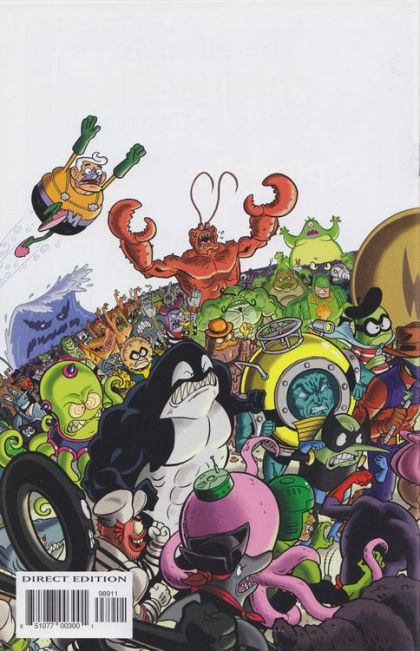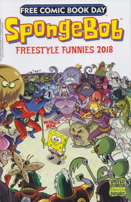 Inspired by SpongeBob's comic book obsession, Plankton teams up with underwater super-villains to steal the Krabby Patty formula! But he may have gotten in over his tiny green head when word of his plan gets out in the aquatic bad-guy community! Soon, the Chum Bucket is filled with every Mermaid Man adversary we could fit into one story! How will Mr. Krabs fend off this evil, if somewhat over-large, invasion? Plus: In "Patrick Versus Somebody," enjoy the spazzy antics of Patrick and SpongeBob as they attempt to transform Patrick into a living comic book! All this, plus ocean facts from Maris Wicks and an amazing wraparound cover from Jacob Chabot! All-Ages.