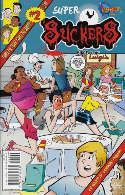 Binge Books' new SitComics imprint launches with this hilarious, 68-page standalone classic from Seinfeld writer Darin Henry & cartoonist Jeff Shultz (Betty & Veronica). College students Jess and Kelly catch a rare STD called "vampire" just as a sexy but deadly vampire slayer hits town! To stay alive, they must figure out what vampires do out of the shadows with help from their new "suck buddy" Stewart, and Vera, the exhibitionist roommate from hell! With laugh-out-loud Sit-Commercials drawn by Renee Reeser Zelnick, Jason Yungbluth and New Yorker artist Lonnie Millsap, Super 'Suckers is TV you read!
