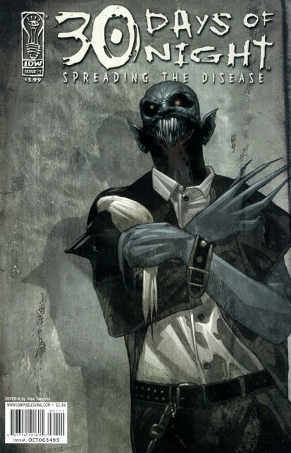 Cover by Nat Jones. Written by Dan Wickline. Art by Alex Sanchez. Crawling from the wreckage of 30 Days of Night: Dead Space is this latest five-part continuation of the 30 Days of Night saga. In part one of Spreading The Disease, Agent Michael Henson had all the evidence he needed to prove to the world that vampires exist... until the government took it all away. Now, urged on by a mysterious "friend," Henson must follow a path of carnage and gore in hopes of finding the answer to why anyone would want to put a vampire into space, with his only lead being to follow the fangs. Dan Wickline (30 Days of Night: Dead Space), Alex Sanchez (Doomed) and Jay Fotos (Clive Barker's The Great and Secret Show) bring you this stunning tale of mystery and horror, with alternate covers provided by Nat Jones (30 Days of Night 2005 Annual). Covers will be shipped in a 1-to-1 ratio. Mature readers, 32 pages, full color. Cover price $3.99.