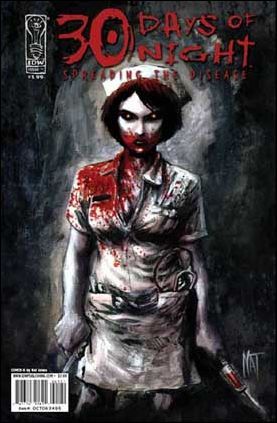 Cover by Nat Jones. Written by Dan Wickline. Art by Alex Sanchez. Crawling from the wreckage of 30 Days of Night: Dead Space is this latest five-part continuation of the 30 Days of Night saga. In part one of Spreading The Disease, Agent Michael Henson had all the evidence he needed to prove to the world that vampires exist... until the government took it all away. Now, urged on by a mysterious "friend," Henson must follow a path of carnage and gore in hopes of finding the answer to why anyone would want to put a vampire into space, with his only lead being to follow the fangs. Dan Wickline (30 Days of Night: Dead Space), Alex Sanchez (Doomed) and Jay Fotos (Clive Barker's The Great and Secret Show) bring you this stunning tale of mystery and horror, with alternate covers provided by Nat Jones (30 Days of Night 2005 Annual). Covers will be shipped in a 1-to-1 ratio. Mature readers, 32 pages, full color. Cover price $3.99.