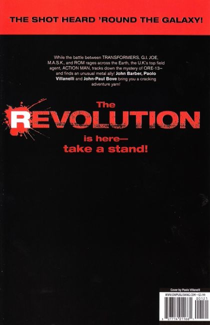 REVOLUTION WORLDWIDE! While the battle between TRANSFORMERS, G.I. JOE, M.A.S.K., and ROM rages across the Earth, the U.K.'s top field agent, ACTION MAN, tracks down the mystery of ORE-13-and finds an unusual metal ally!
