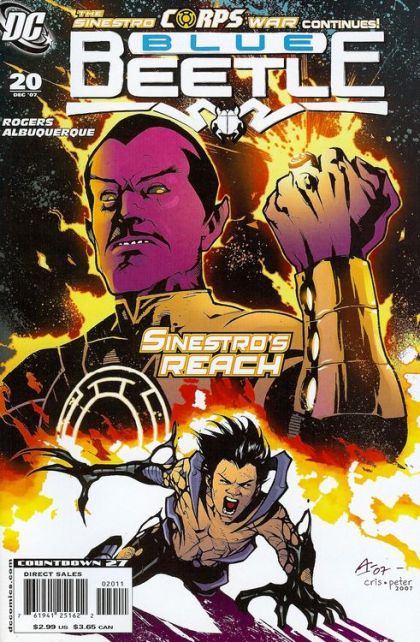 As the Sinestro Corps War rages, Peacemaker is approached by a Sinestro ring, attracted to the scarab he has buried within him. The Reach realize that the ring is attracted to it and decide to activate Peacemaker's scarab, allowing him to become, in effect, a Sinestro ring-powered Beetle.Blue Beetle investigates and finds his friend possessed by both the scarab and the ring and is attacked by him, saved only by the arrival of the Green Lantern, Brik who, as an enemy of both the Reach and the Sinestro Corps is content to let Blue Beetle and Peacemaker kill each other. Beetle convinces her that Guy Gardner has already spoken with him and together they distract the Peacemaker long enough to allow Beetle to infiltrate his mind where, both he and the Peacemaker discover, the Beetle demonstrates its autonomy by defeating the mental version of the Peacemaker's scarab. With the Sinestro ring and the Reach's scarab defeated, Peacemaker makes the decision to physically remove the scarab from his spine, and act which wounds him terribly and may lead to his death.