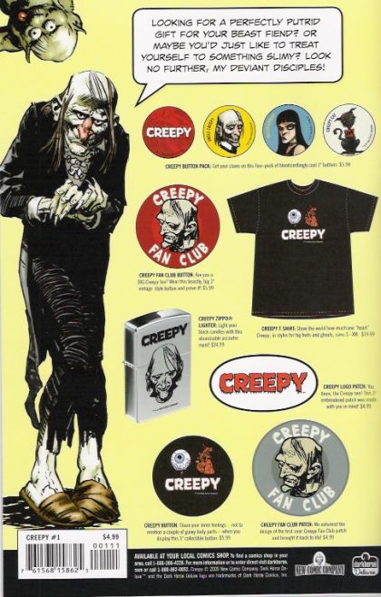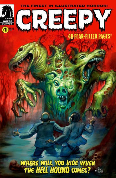 Neil Kleid (W), Joe Harris (W), Dan Braun (W), Mike Woods (W), Angelo Torres (A), Bernie Wrightson (A), Jason Shawn Alexander (A), Eric Powell (Covers), and others On sale July 15 b&w, 48 pages $4.99 Ongoing What's black and white and clawing its way onto your reading list? It's the newly resurrected Creepy, of course! Now, don't fret, my putrid pets-these new terror tales are cut from the same cursed cloth as the outlandish originals, telling contemporary horror stories with gorgeously ghoulish art from a lineup that'll make you lose your head! Original Creepy artist Angelo Torres teams up with devilish Dan Braun on 'Hell Hound Blues'; Michael Woods and artist Saskia Gutekunst serve up a dose of 'Chemical 13'; Neil Kleid and Brian Churilla provide 'All the Help You Need' at a weird weight-loss camp; and jaundiced Jason Shawn Alexander brings his phenomenal painting skills to Joe Harris's 'The Curse'! Plus Bernie Wrightson, the return of 'Loathsome Lore,' and more. All this, plus one classic story from Uncle Creepy's dank dungeon, and you've got 48 freakish pages of terror to bring home to mummy! o This big book of boo will be a regular quarterly offering! o Features a painted cover from Eric Powell!