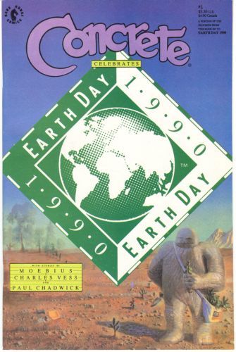 By Paul Chadwick & Charles Vess & Moebius. Cover by Paul Chadwick. On April 22, 1990, the world joined together in an effort to make the population of the Earth aware of the environmental dangers we face. As their contribution to the cause represented by Earth Day 1990, Paul Chadwick, and Dark Horse Comics have joined together to create a unique comic experience- Concrete Celebrates Earth Day. A 32 page full color comic, Concrete Celebrates Earth Day contains new stories featuring Chadwick's Harvey and Eisner award-winning character Concrete, plus stories by artists Moebius and Charles Vess, all designed to heighten our awareness of the environmental problems that threaten us all. It is a comics experience that is not to be missed. FC. Cover price $3.50.