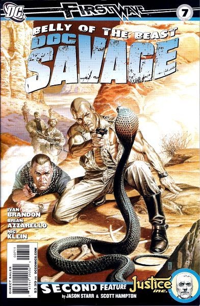 Written by BRIAN AZZARELLO & IVAN BRANDON Co-feature written by JASON STARR Art by NIC KLEIN Co-feature art by SCOTT HAMPTON Cover by J.G. JONES FIRST WAVE architect Brian Azzarello joins rising star Ivan Brandon for an epic journey to the Middle East, a land decimated by war - but still full of terrible secrets! One of Doc's closest friends is lost among the shifting sands of the Forbidden Zone, and Doc'll have to fight his way through the Zone's battle-hardened inhabitants before he can come face-to-face (to face?) with the monster holding his ally captive: The Two Who Are One! And in the JUSTICE, INC. co-feature, Smitty is hot on the trail of the two-bit thug he's made the target of his bloodlust, but his tunnel vision is leading him into a dangerous trap. And if the only light at the end of the tunnel is the Avenger, then there's no light in this world at all! On sale OCTOBER 13 ? 40 pg, FC, $3.99 US