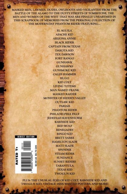 Masked men, lawmen, dudes, owlhoots and vigilates! From the battle of the Alamo to the dusty streets of Tombstone, the men and women of the West that was are finally unearthed in this scrapbook of memories from the personal collection of the modern-day Phantom Rider! Featuring entries on the Black Rider, Tex Dawson, Gunhawk, Kid Colt, the Masked Raider, the Outlaw Kid, the Phantom Rider, the Rawhide Kid, the Steam Rider, the Two-Gun Kid and more!