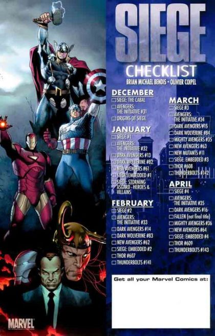 SIEGE is almost upon us! And this special giveaway issue contains everything readers will need to prepare themselves for the ultimate conflict to hit the Marvel Universe, six years in the making! Showcasing an ALL-NEW lead-in story featuring Loki, the God of Evil, ORIGINS OF SIEGE also contains an ALL-NEW origins section covering all of the major players in the battle, as drawn by the biggest artists at Marvel, as well as pinups and a checklist so you don't miss a single important issue. All that and a preview of SIEGE #1! It's time! 32 PGS./Rated T+?FREE (retailer note: it is only free if distributed on Dec. 30th) *Check upcoming Marvel Mailers for ordering information