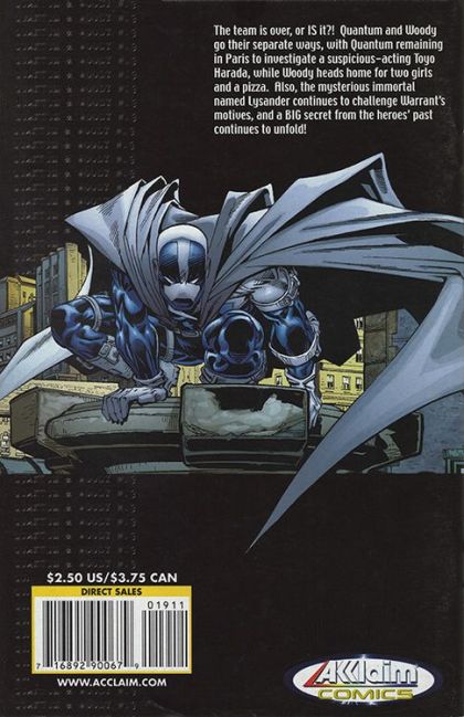 The team is over...or IS it?! Quantum and Woody go their separate ways, with Quantum remaining in Paris to investigate a suspicious-acting Toyo Harada, while Woody heads home for two girls and a pizza. Also, the mysterious immortal named Lysander continues to challenge Warrant's motives, and a BIG secret from the heroes' past continues to unfold!