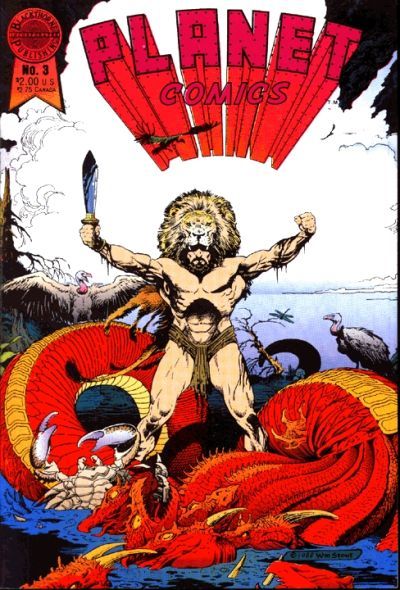 Stories by Bruce Jones. Art by Adrian Moro, Ken Hooper and Rico Rival. Cover by William Stout. Blackthorne Publishing resurrects the original Planet Comics title published by Fiction House in the 1940s-50s. Writer Bruce Jones even revives Matt Baker's gypsy adventurer, Flamingo, and original Planet Comics heroes Bowman and Lyssa, Queen of the Lost World, battling the reptilian Voltamen to free Earth. Featuring another cover by legendary artist William Stout, and cameos by jungle heroes Sheena, Queen of the Jungle and Ka'a'nga. Hunt Bowman in The Lost World; Flamingo; Secret Circle. Final issue of the series. 32 pages, Full Color. Cover price $2.00.