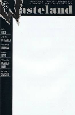 The real #6, all white cover with black border. Stories by Del Close and John Ostrander. Art by David Lloyd, William Messner-Loebs and George Freeman. Nine out of ten doctors agree -- Wasteland can be hazardous to your sanity! Three more twisted tales from twisted imaginations. Featuring: "Method Actor"; "Paper Hero"; and "On the Road part 1 or How We Changed the Price of Whiskey at the Butterfly Mine #2 in West Virginia"! 32 pages, full color. Mature Readers. Cover price $1.75.