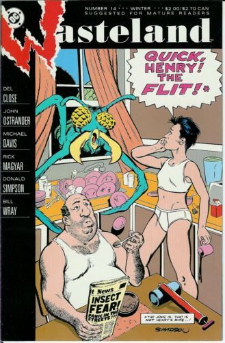 Rick Magyar joins the team of regular Wasteland artists for another trio of typically terrifying tales taken from the twisted team of John Ostrander and Del Close. Michael Davis and Bill Wray contribute their art, and Donald Simpson provides the cover. Suggested for Mature Readers. Deluxe format. Cover price $1.75.
