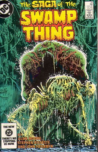 "The Burial!" Written by Alan Moore. Art by Shawn McManus. Cover by Stephen Bissette and John Totlebin. A plant. A vegetable. A muck-encrusted echo of a man. That's all he ever was. That's all he'll ever be. Swamp Thing learned the truth about himself and he doesn't like it. Can Swamp Thing come to a peaceful resolution, or will the truth about himself destroy his future? 32 pages, FC. Cover price $0.75.