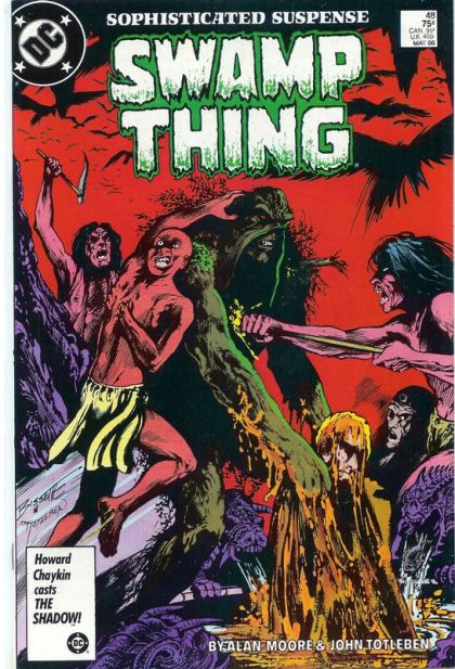 Cover by Stephen R. Bissette and John Totleben. A Murder of Crows, script by Alan Moore, art by John Totleben; John Constantine's assembled cohort of mystics lead Swamp Thing to a cave where a group called the Brujeria are concocting a scheme to infect the world with evil--but when Swamp Thing tries to save Constantine from their clutches, he allows one of the mystics, now transformed into a evil, bird-like being, to escape. 36 pgs., full color. $0.75. Cover price $0.75.